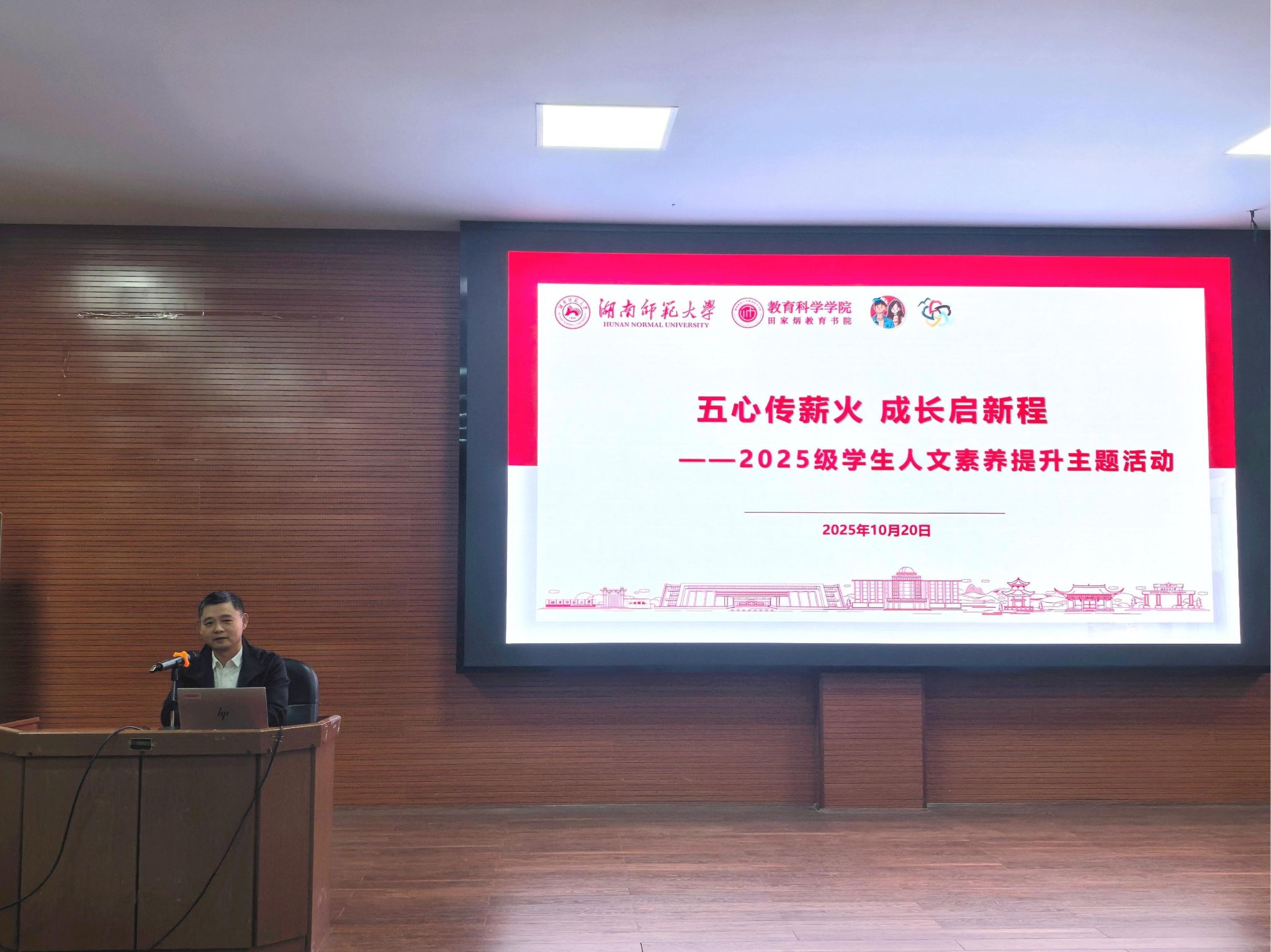 (通讯员 吴杨 傅双娇)10月20日下午,我院在张公岭图书馆报告厅开展“五心传薪火 成长启新程”2025级人文素养提升主题活动。院长刘铁芳教授为2025级本科新生作题为“做有格局的人:大学生何以健全成人”的专题讲座。