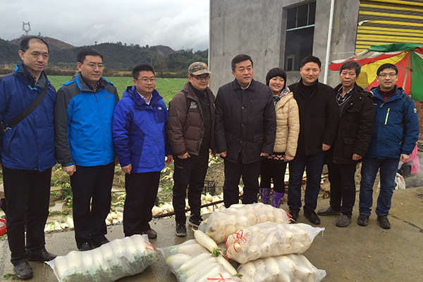 实地察看结束后,李民与湖南日报经济部主任孙振华、步步高集团产业扶贫部部长邹爱华一起来到步步高集团插柳村精准扶贫农产品直供基地萝卜采购现场,见证我校与步步高集团联手合作,共同助力插柳百姓和贫困户通过订单式农业脱贫致富的产业发展项目。步步高集团直供基地是李民协调、引进的爱心企业,今年插柳村首次种植萝卜面积近200亩,步步高集团让利于老百姓,按市场价进行收购。李民对步步高集团的爱心相助表示感谢,同时鼓励老百姓和贫困户抓住好的政策和机遇,通过勤奋脱贫致富。参加完步步高集团的现场采购,李民还接受了湖南日报的专门采访。