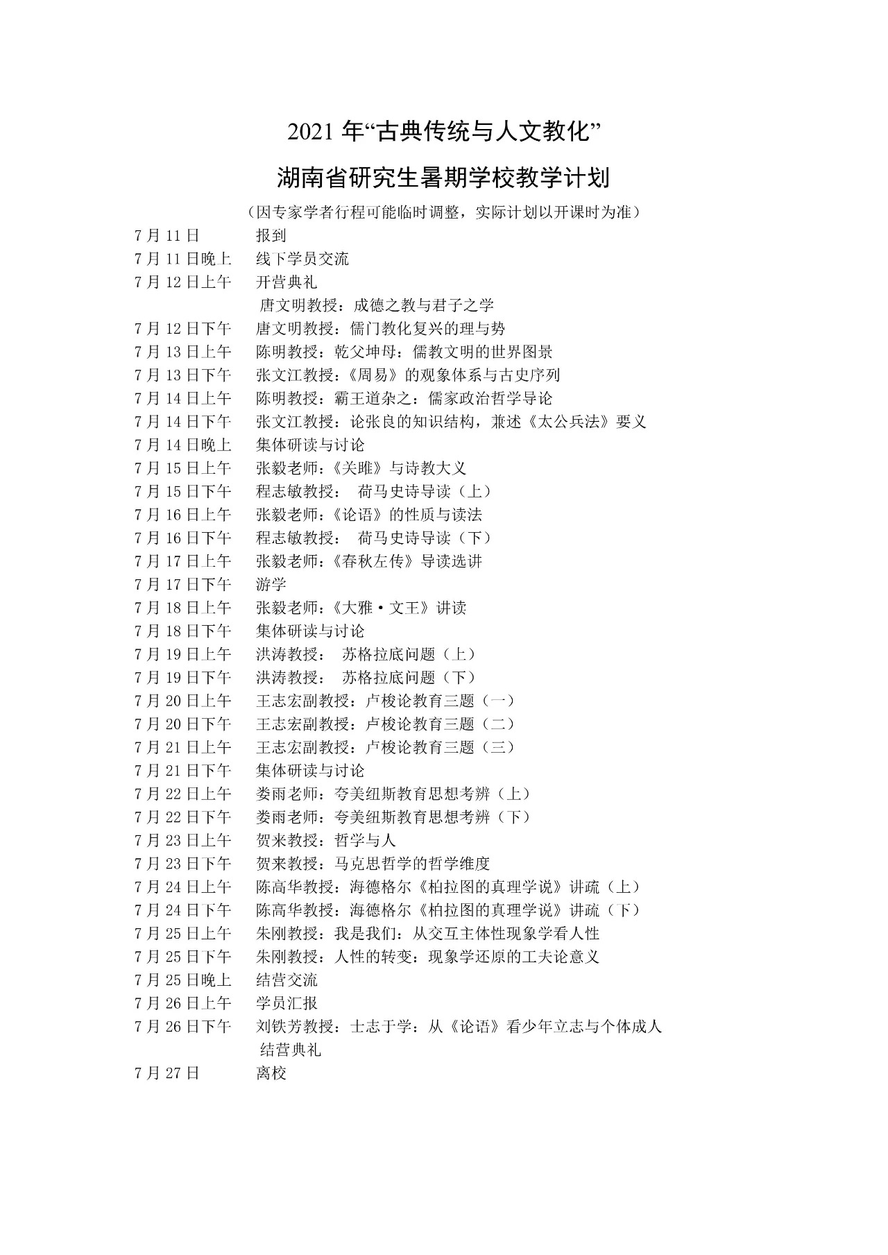 附一:2021年“古典传统与人文教化”湖南省研究生暑期学校教学计划