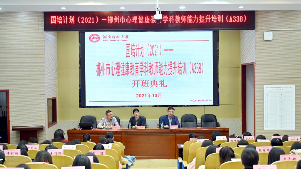 (通讯员李可心)2021年10月10日上午,由湖南师范大学教育科学学院承办的“郴州市心理健康教育学科教师能力提升培训项目”在湖南师大教科院101学术报告厅顺利开班。湖南师范大学教育科学学院党委书记汪植英,副院长丁道群教授以及培训班全体学员参加了开班典礼。开班典礼由湖南师范大学教育科学学院培训办主任杨铁林主持。