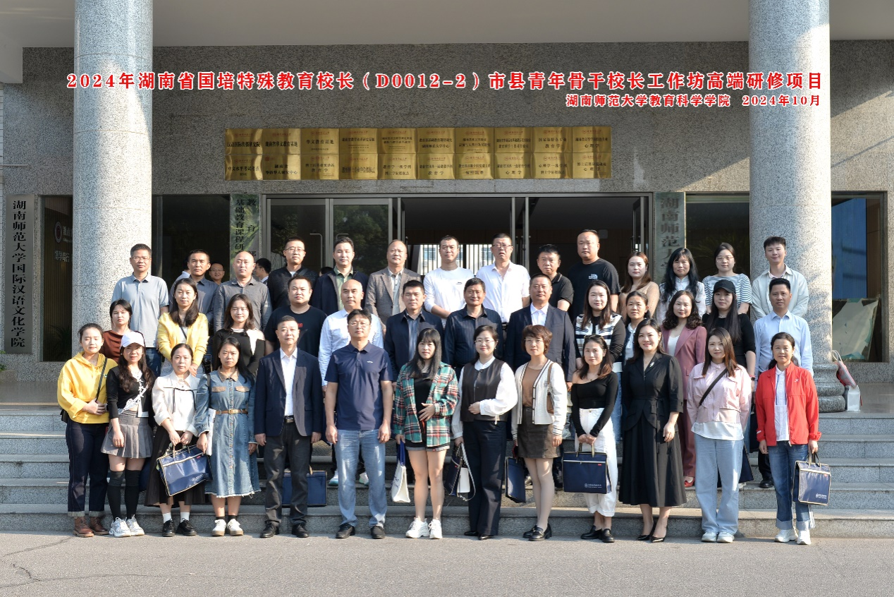 近日,国培2024年湖南市县特殊教育青年骨干校长工作坊高端研修班在湖南师范大学教育科学学院顺利开班。湖南师范大学教育科学学院院长刘铁芳、长沙市特殊学校校长王磊,湖南师范大学教育科学学院特殊教育系主任陈杰、成教办主任杨铁林出席开班仪式。