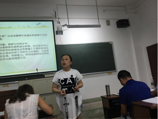 7月22日下午,湖南省长沙市芙蓉区教研中心的殷蓉老师带来了题为《立足学科看教师专业成长》的讲座,殷蓉老师首先从教师的 专业化内涵出发,解释到教师的发展是一个持续不断的过程,教师专业化也是一个发展的概念,既是一种状态,又是一个不断深化的过程。在此次讲座中,殷老师也分享了自身的专业成长历程,并对校级层面 学科教师的专业成长提出了一些相关的建议,例如采取全学科通识培训、分层培训和分学科培训等。同时,鼓励各学员做一个研究型、反思型教师,敢于去做课题,从生活中去寻找课题,提升自己的专业能力。