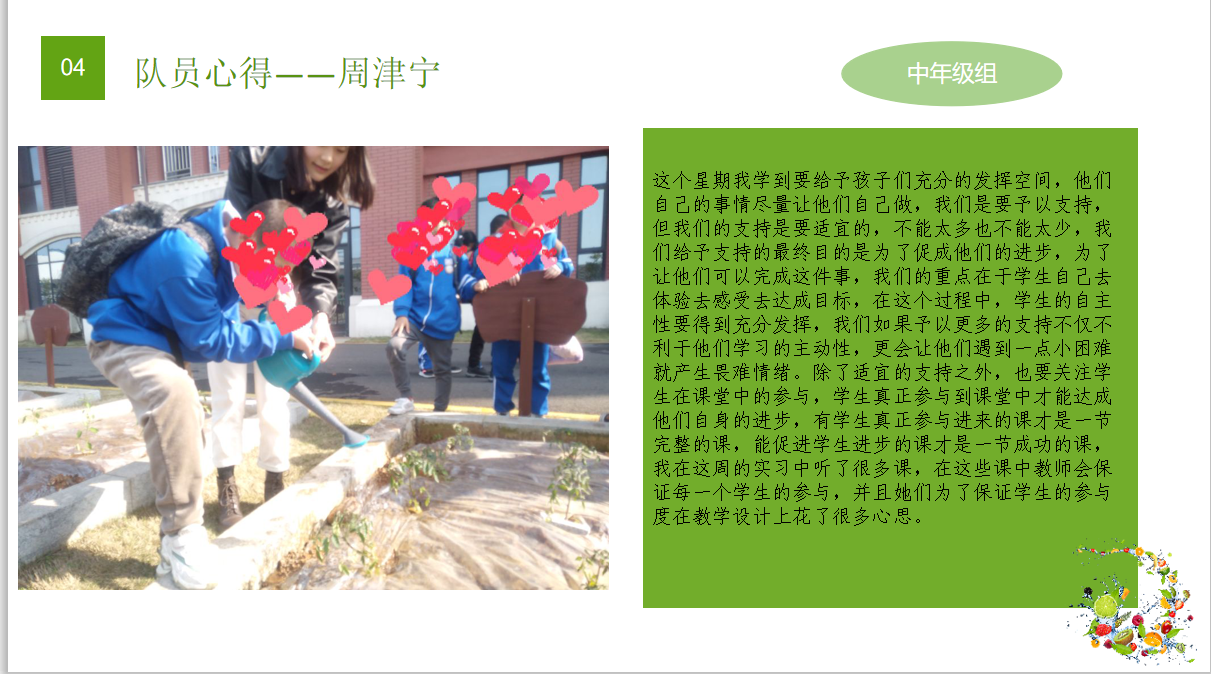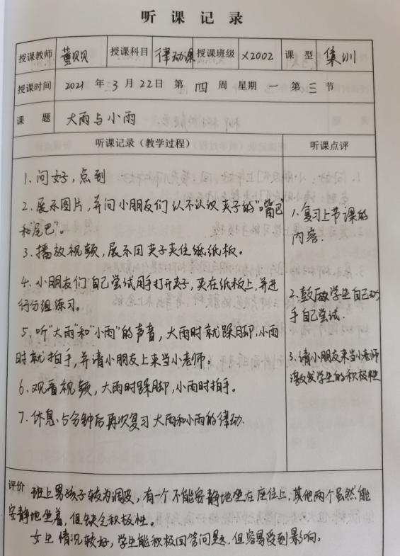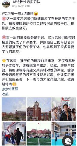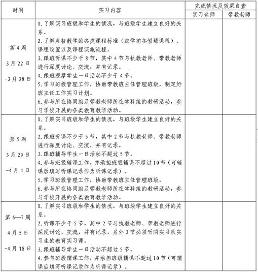 实习队员已按文件《实习教师工作进度单(望城校区)》完成每周的工作任务并由相应的负责人进行检查与监督,并进行相应数量的统计与记录。目前实习队每位员已完成基本的听课18节,辅课20节的任务,并已授课2节起步,完成相应的教案、教具、课件的准备与制作。此外队员需每周撰写500-800字的心得,参加每周例会。现已完成心得4篇,实习日志20篇,开展例会4次。