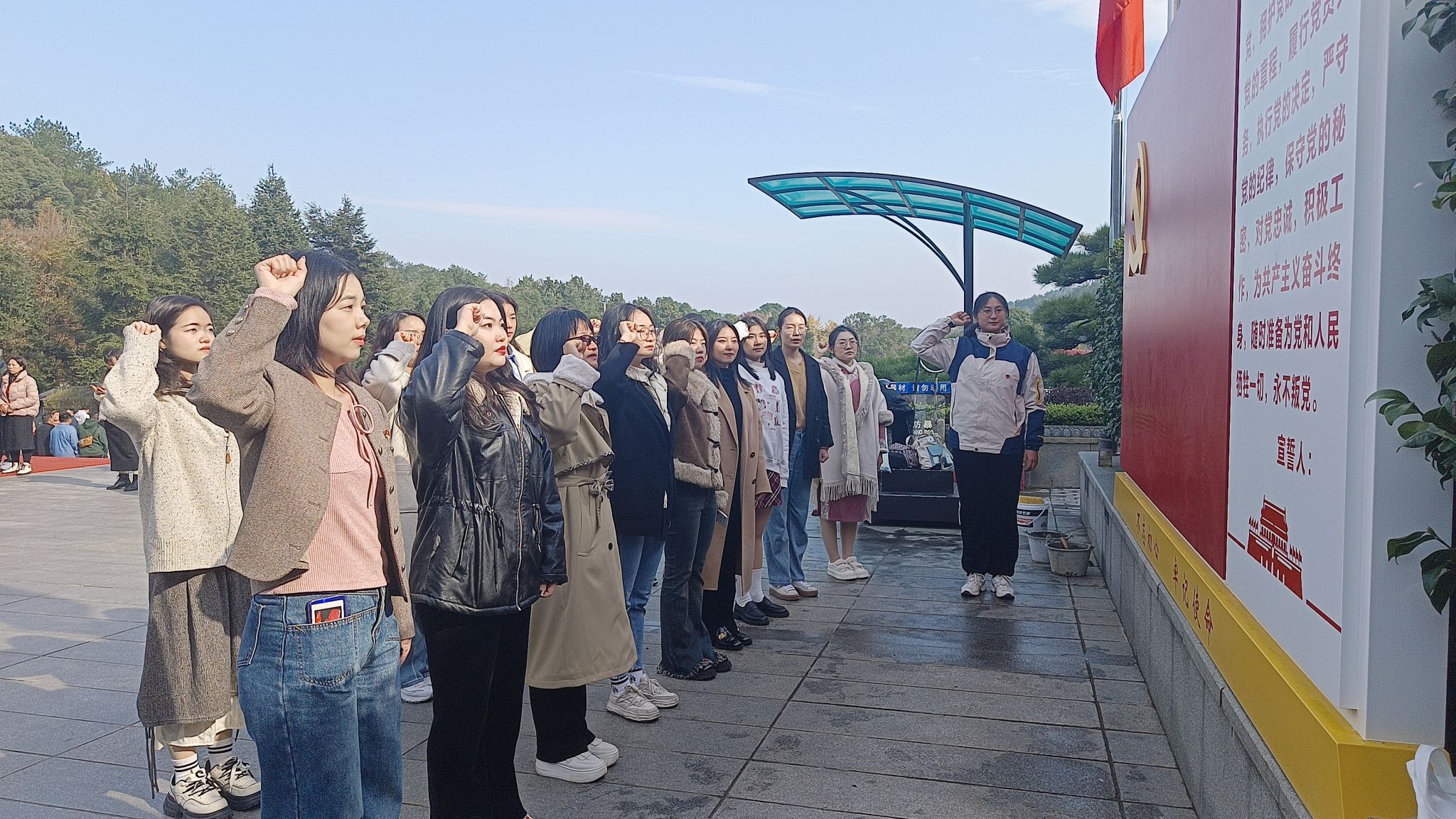到达韶山后,全体党员首先前往毛泽东铜像广场,一同瞻仰毛泽东铜像。青山巍巍,峰峦叠嶂,主席身躯伟岸,双手握书卷,身着中山装,双目炯炯,望这“处处皆景,步步如画”,更望这繁华盛景。全体党员在主席铜像前郑重地举起了右手,重温入党誓词,默哀鞠躬,举行了庄严肃穆的献花仪式,表达了对主席无限的敬仰与深切的怀念。而后,党员同志们怀着虔诚之心探访毛泽东故居。此处依青山,临碧水,山水相融,如诗如画。故居内板凳、耕犁、方桌、木床、蓑衣、牛栏、柴屋、谷仓、猪舍静静伫立,将我们置于主席生活与成长的那一段时光。尽管斯人已逝,然风范永存,正是这些古老而朴素的印记让我们重新望见了一代伟人辛勤劳作、孜孜不倦的日日夜夜。最后,党员同志们在毛泽东同志纪念馆感受了浓厚的革命气息。一件件真实的遗物、一张张泛黄的老照片都无言地诉说着那些历史尘埃的故事,无一不在昭示着伟人以天下为己任的责任担当。